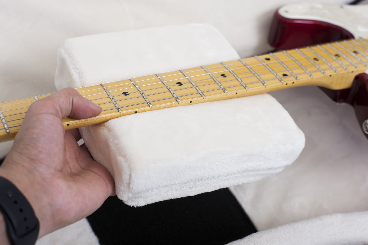 A smaller outer pocket is also included as well as a neck storage pocket for a pack of strings, guitar tuners or other needed guitar tech tools. The features do not stop there! The electric guitar gig-bag also comes with thickly padded, fully adjustable backpack straps and an ultra-padded back support for added comfort while carrying. The sidewalls of the gig bag are packed with protective thick foam to prevent impact damage or dings to your guitars finish, this is just the exterior of the Pro Go gig-bag! The interior is lined with a white, ultra-soft micro-fleece lining. An adjustable neck support is also provided to secure the neck of your precious electric guitar. The interior lining also features black nylon patches at the bottom of the bag and at the headstock to protect the super-soft lining of the gig-bag from string damage. The Pro Go series also features a shock absorbing body block with a strap nut indent that sits at the bottom of the guitar to prevent damage to the strap nut or lower bout of the guitar.